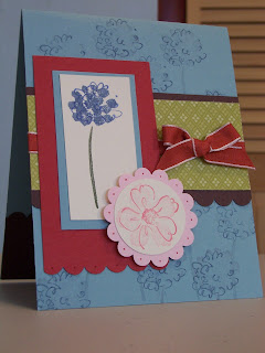 Heartfelt Thanks stamp set, Markers (Brocade Blue, Always Artichoke), Pretty in Pink, Regal Rose ink, Versa Mark, Riding Hood Red ribbon, Baja Breeze cs, Riding Hood Red cs, Very Vanilla cs, Chocolate Chip cs, Kiwi Kiss Pattern Paper, Scallop Edge & Scallop circle punch, 1 3/8" circle punch, dimentionals.
